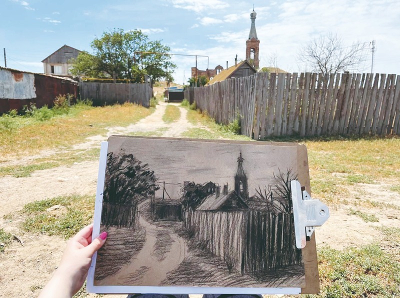 11 июля ребята посвятили поездке в с. Большой Могой. Для поездки в район арендовали большой автобус на всю группу. Художники провели весь день на природе, на пароме добрались до главной достопримечательности села – церкви Трех Святителей. Кто-то сразу расположился и принялся работать, кто-то ходил в поисках ракурса повыгоднее. Преподаватели тоже рисовали вместе со студентами, параллельно консультируя и давая советы ребятам. Например, рекомендовали не только изображать церковь «в лоб», как на открытке, но и поискать более интересные композиции, включающие в себя деревенские улочки, степь, берег реки и другие объекты.