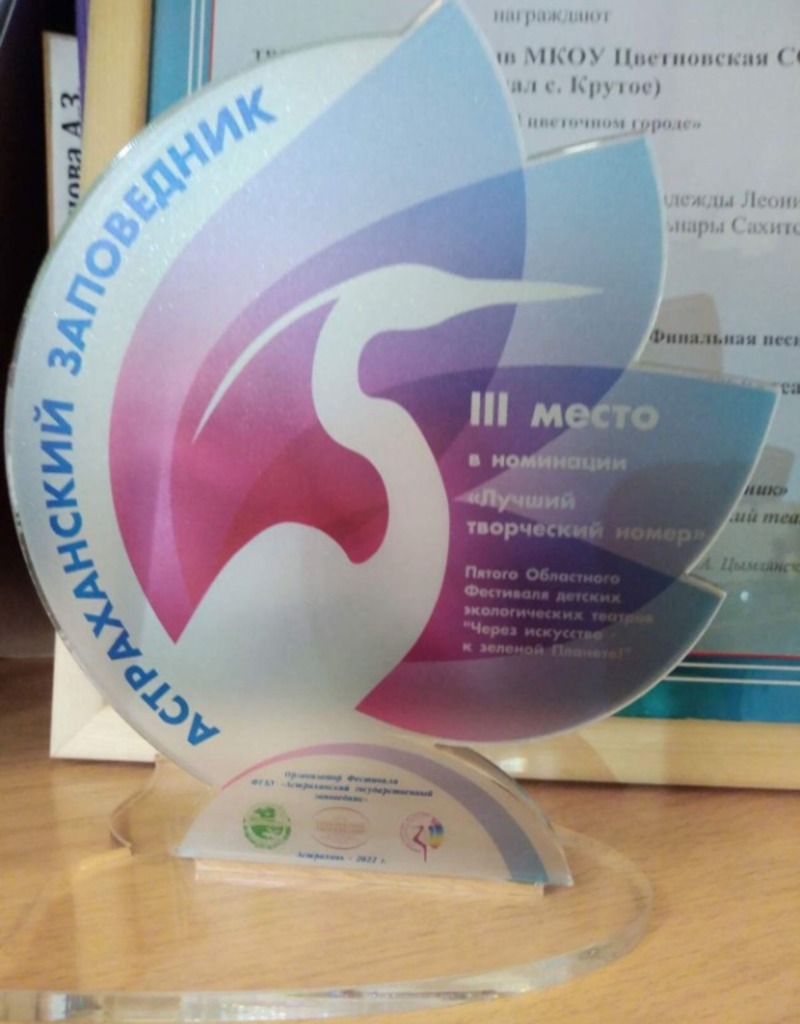 26 октября участники V Областного фестиваля детских экологических театров «Через искусство – к зелёной планете» приняли участие в подведении итогов этого конкурса. Мероприятие прошло в Астраханском драматическом театре. Именно там творческий коллектив крутовского филиала цветновской школы был награжден Грамотой Министерства природных ресурсов РФ и ФГБУ «Астраханский государственный заповедник» за третье место в номинации «Творческий номер» (финальная песня).