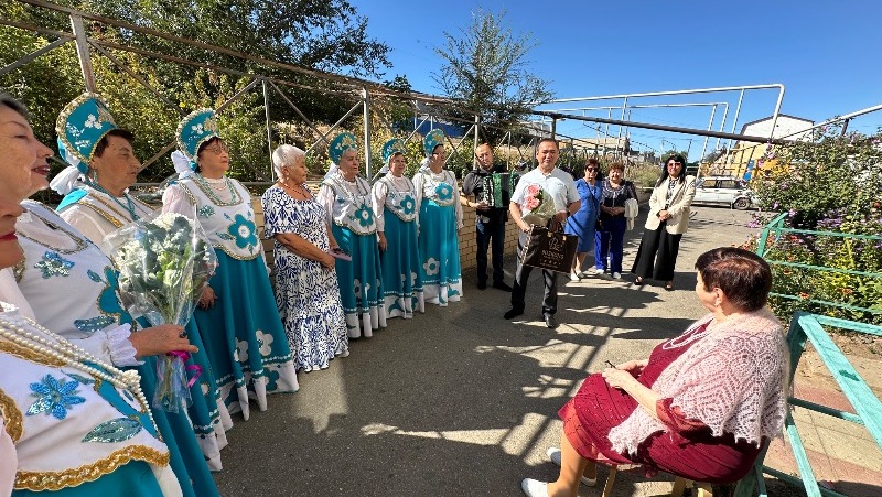 К поздравлениям присоединились представитель Комплексного центра, руководитель Районного центра культуры Д. Телеушев и депутат райсовета по второму округу Елена Шарова. На звонкие голоса и звуки баяна стянулись и соседи, которые сказали свои слова поздравления имениннице.